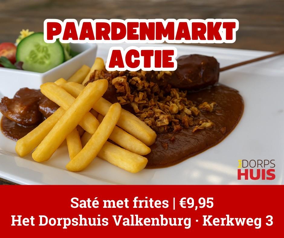 Tijdens de Paardenmarkt geniet je in Het Dorpshuis van saté met frites voor €9,95.